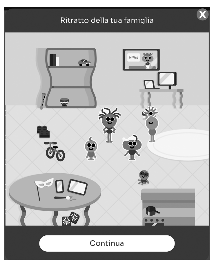 App PAROLA è suddivisa in 6 diverse sezioni. La sezione 1, denominata Presentazioni, rappresenta un’area personalizzabile dove i genitori possono inserire informazioni sul loro bambino e sulla loro bambina rispondendo a semplici domande relative alla composizione familiare, allo status socioeconomico, al contesto linguistico di esposizione e alla quantità e qualità dell’input linguistico per ogni lingua parlata in famiglia. Le domande sono presentate con elementi di gamificazione per aumentare il coinvolgimento dei genitori (Cheng et al., 2019). Al termine della compilazione della sezione 1, i genitori ricevono sul proprio profilo della webapp PAROLA il Ritratto di Famiglia (si veda la Figura 1) dove sono rappresentati, in modo giocoso, i membri della famiglia, alcuni materiali e i dispositivi elettronici presenti in casa.