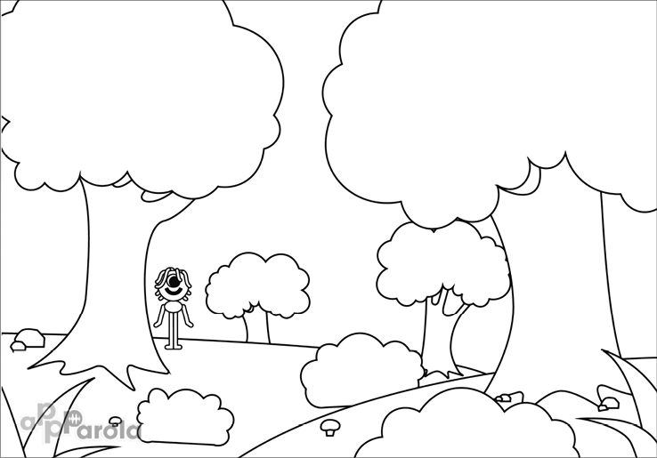 La sezione 4 di app PAROLA, denominata Ludoteca, è strettamente collegata alla sezione 3 dal momento che rappresenta un contenitore, un baule di giochi, dove il genitore può trovare materiali stampabili, musiche da ascoltare e storie da leggere. Questa sezione rappresenta uno spunto per i genitori, con l’auspicio che essi possano successivamente utilizzare sempre di più materiali disponibili in casa e modificare le attività proposte. Nella Figura 2 è presente un esempio di disegno da stampare e poter colorare per scoprire dove si è nascosto il mostriciattolo.