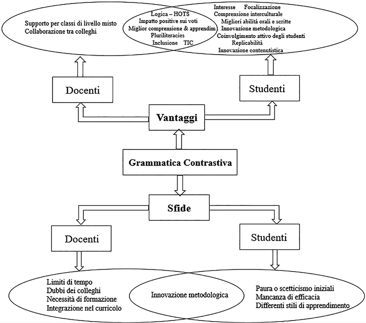 This article explores the role of Contrastive Grammar (CG) in language teaching and learning, highlighting its first practical application in Italy with regard to the Italian-English combination and the related pedagogical implications, both observed and future ones. In a school context of increasing cultural and linguistic superdiversity (Vertovec, 2007), contrastive practices could support the development of a «more inclusive curriculum» (Santipolo, 2020), yet recent insights on the morphological aspects of such practices are still limited (Cognini, 2022). Therefore, starting from an analysis of the existing literature, this study identifies some research gaps and aims to contribute to filling them through a qualitative exploratory case study (Yin, 2018), involving two teachers and 44 students from an upper secondary school. Semi-structured interviews and focus groups were the means for collecting participants’ perceptions at the end of an experimental CG course, while spreadsheets and QDA Miner Lite software were used for coding. The interview data were triangulated with document analysis from summative assessments administered to one of the two classes involved. The results, although limited to a single school, indicate that CG can promote awareness, critical thinking, and the ability to learn independently. Metacognitive reflection on language as fostered by CG may help all students succeed, especially those with fewer opportunities. Finally, the study outlines the possible applications of CG in the Italian educational context, also in view of potential future research.